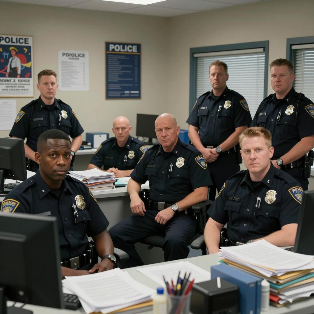 Police officers in dark uniforms sit and stand in a cluttered office. Six officers, including one black man and five white men, have intense expressions. One officer leans on a desk, others sit or stand around it. Office walls have posters, signs, and files. Desks have stacks of papers and office supplies. One officer has a bald head, others have short hair. The setting is a police station.