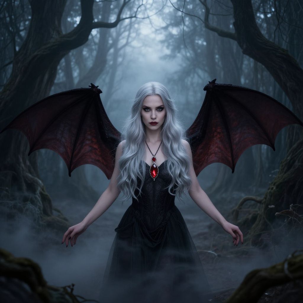 Digital artwork of a pale-skinned, blonde-haired vampire woman with red eyes, black velvet dress, and red bat wings, standing against a dark background