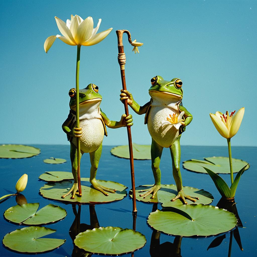 High-detail oil painting of two green frogs standing on lily pads in a calm pond. One frog holds a tall white lily flower, while the other holds a walking stick and a smaller white flower. The background features a soft blue sky, creating a peaceful and natural aesthetic.