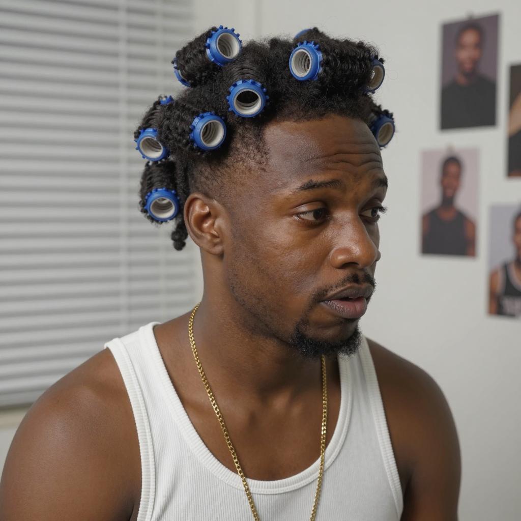 Black man with medium-dark skin and high-top fade hairstyle, secured with blue plastic rollers, wearing a white tank top and gold chain. He looks to the side with a slightly pained expression. Blinds in background, wall with pinned photos on the right. Indoor setting. Photograph.
