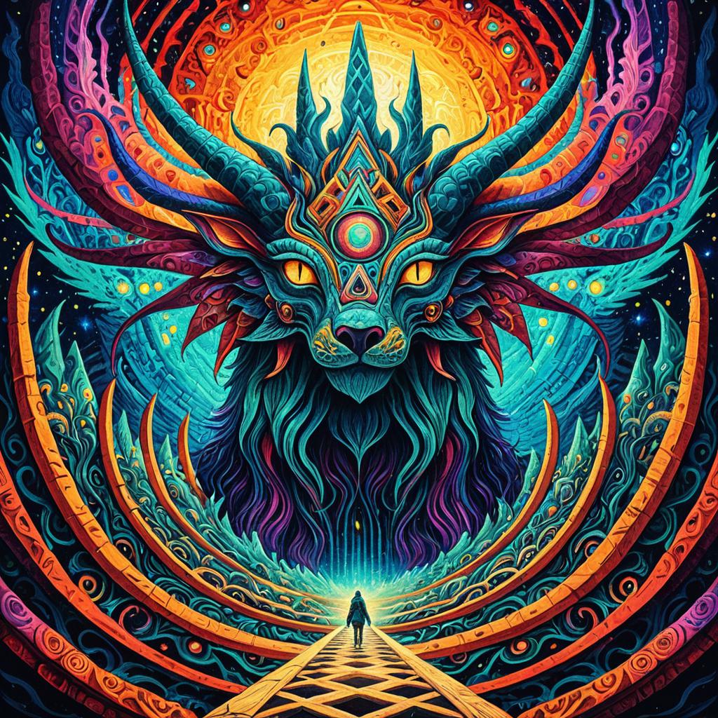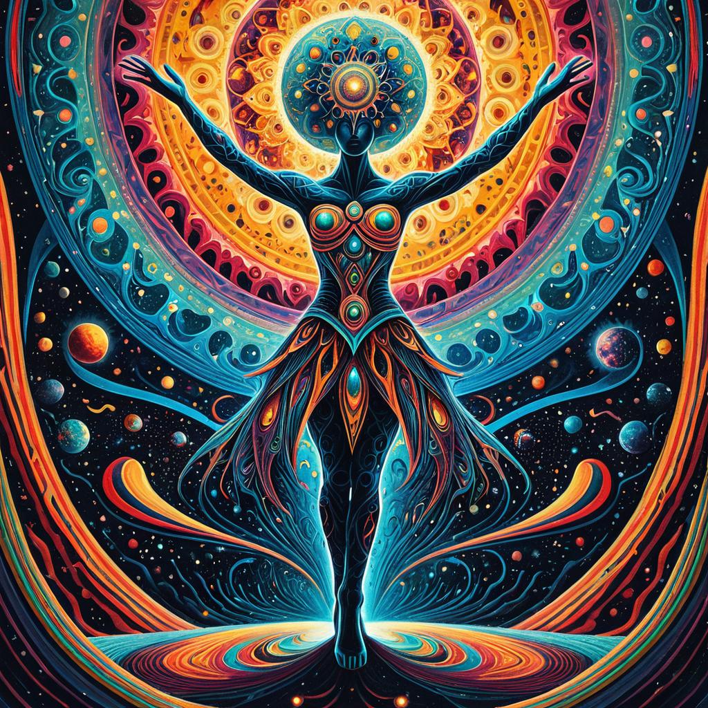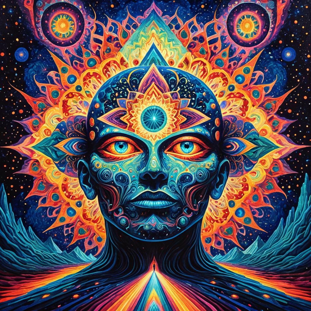 Intricate surreal psychedelic painting depicting a philosopher's mind with non-Euclidean dream-like structures. The artwork features vivid, trippy colors and swirling patterns in an oil painting style, conveying a visionary, high fantasy concept inspired by DMT aesthetics and colorful hallucinations. Central to the composition is a detailed humanoid face with mystical symbols and glowing eyes, set against a cosmic backdrop with radiant sun and planetary elements.