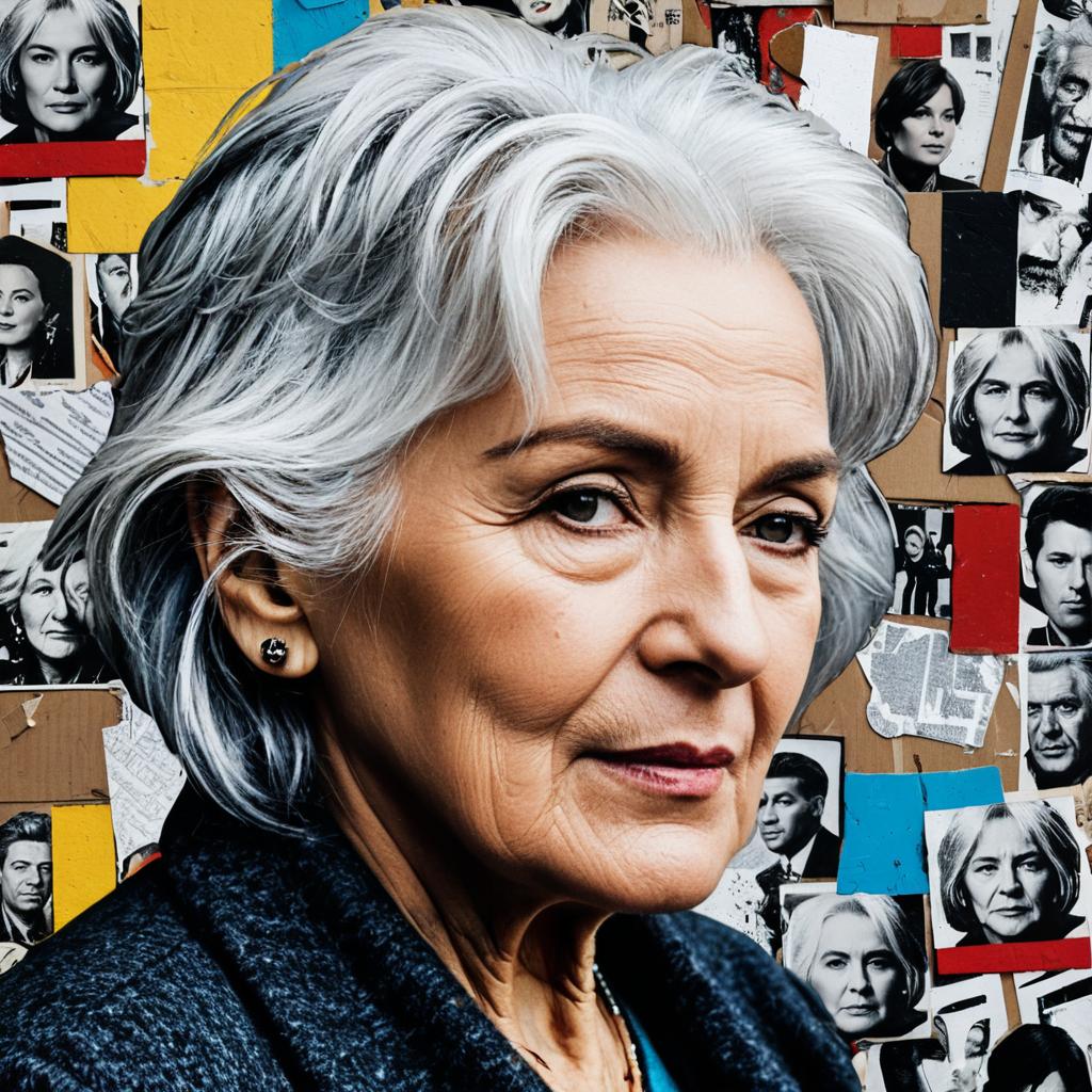 Elderly woman, with silver hair, in the style of multi-layered collages, edgy street art, celebrity-portraits, cardboard, fragmented icons, realistic hyper-detail, crossed colors