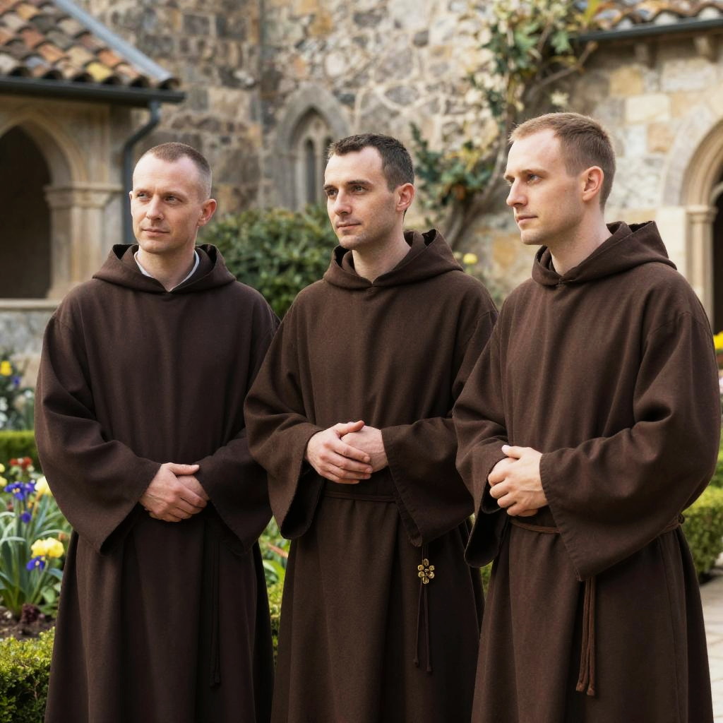 Hair Franciscan monks with visible tonsure haircuts in humble brown robes, tending a lush monastery herb garden at dawn, soft focus background, natural lighting, medieval vibe