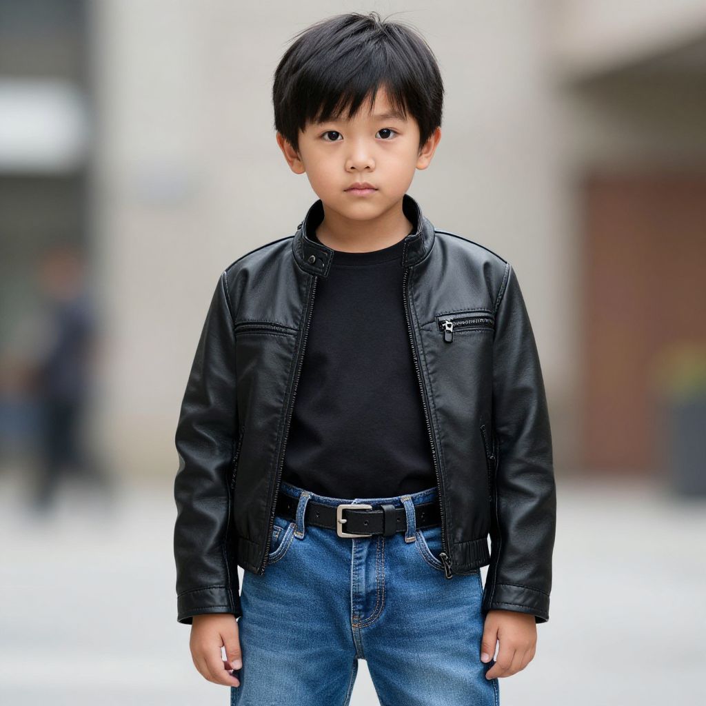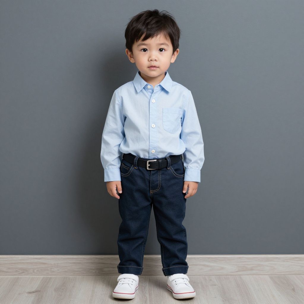 Photograph of an Asian toddler boy with short black hair, wearing a brown cowboy hat, white button-up shirt, and dark jeans, standing against a