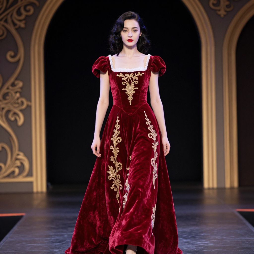 A photo of a fair-skinned woman with dark, wavy hair, wearing a stunning red velvet gown with puffed sleeves and intricate gold embroidery. The dress has a fitted bodice with white lace trim. She's walking confidently on a dark stage with ornate gold-trimmed arches in the background. Her bold red lipstick contrasts with her elegant attire. The lighting highlights her regal appearance.