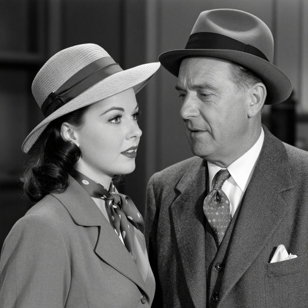 This black-and-white photograph depicts a vintage scene of a man and woman standing close together, both wearing 1940s-style attire. The woman, on the left, has dark, wavy hair and wears a wide-brimmed straw hat with a dark ribbon, a polka-dotted bow tie, and a tailored jacket. She looks at the man with a slight smile. The man, on the right, has a stern expression and wears a dark fedora, a three-piece suit, a white shirt, and a patterned tie. His jacket has a folded pocket square. The background is blurred, suggesting an indoor setting with dark, wooden paneling. The image has a classic, nostalgic feel, emphasizing the elegance and formality of mid-20th-century fashion.
