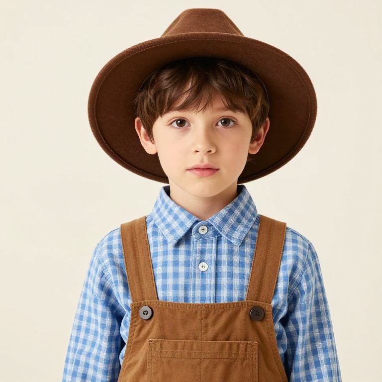 Boy with brown hair, wearing a brown coat with black polka dots and a brown hat.