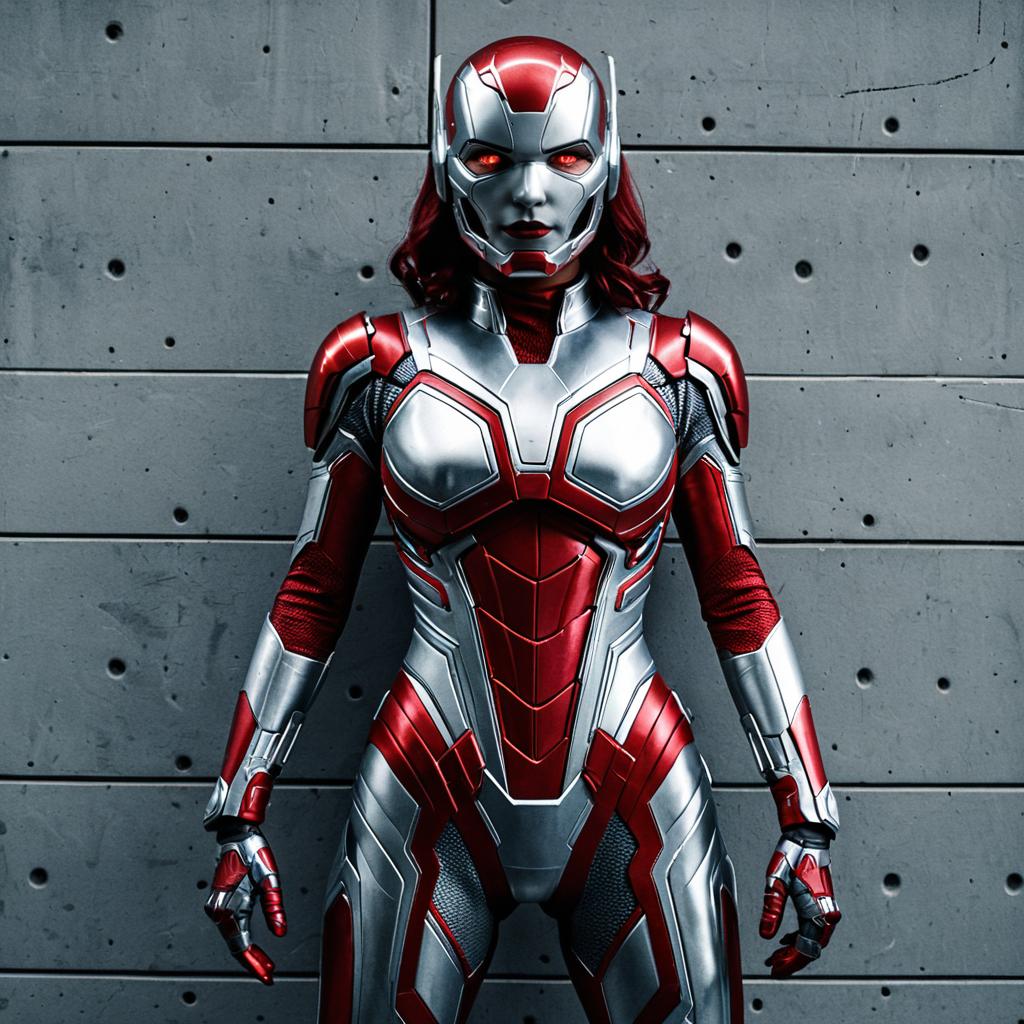 Photograph of a female superhero in a metallic red and silver armored suit, standing against a gray concrete wall with visible bolts. She has red hair peeking from under her helmet and red eyes, with a stern expression. Her suit features segmented armor plates, red accents on the chest, shoulders, and thighs, and silver on the torso and arms. The image has a high-contrast, comic-book style with a slight digital enhancement, emphasizing the metallic textures of her suit and the ruggedness of the concrete wall. Her stance is confident, with arms slightly apart.