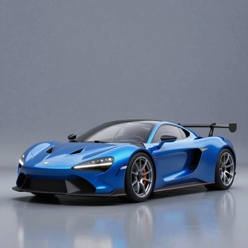 GT1RS concept car design in a studio environment, minimalist background, emphasizing smooth curves and aerodynamic form, vibrant metallic blue color, futuristic LED lights, high-resolution rendering highlighting every design feature