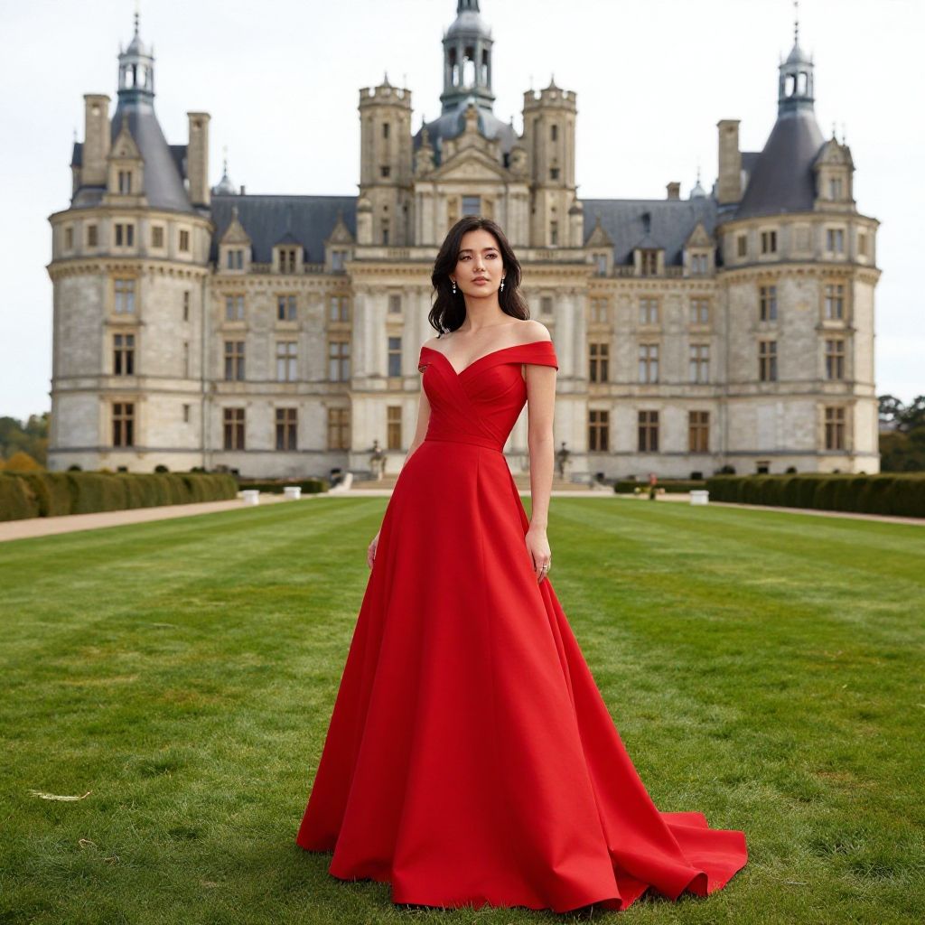 Photograph of a young woman standing in front of a grand, historic French chateau. She has fair skin, dark wavy hair, and is wearing an off-the-shoulder, vibrant red, floor-length gown with a fitted bodice and flowing skirt. The chateau in the background has multiple turrets, gray slate roofs, and beige stone walls. The lush green lawn stretches out in front of the chateau, and the bright red of her dress contrasts sharply with the green grass and beige building. The sky is overcast, adding a subtle gray tone to the background.