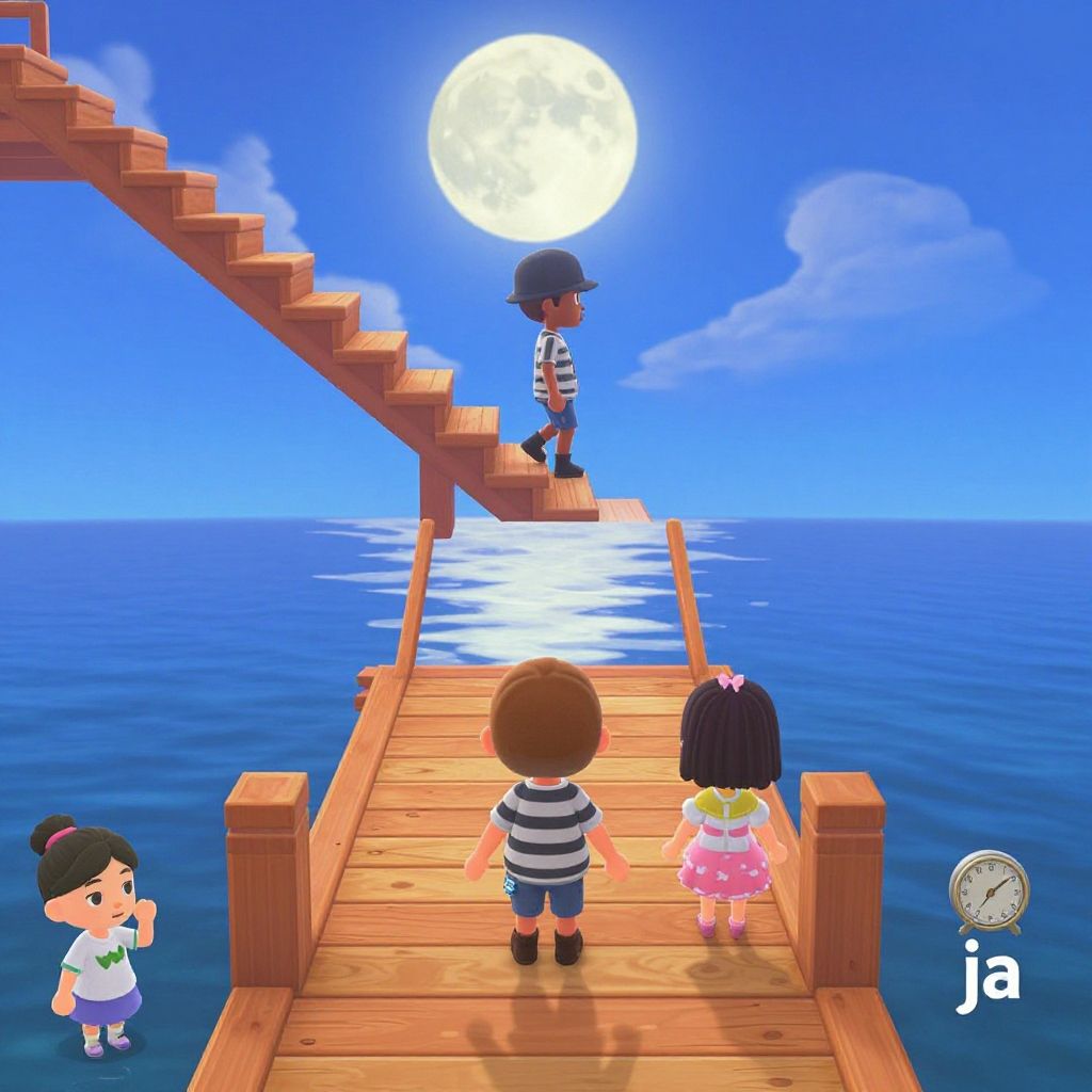 Animal crossing style a painting of a man walking down a flight of stairs into the sky, josan gonzales and dan mumford, the moon reflects in the water, cinematic pinterest style, symmetrical artwork. cinematic, wooden bridge, dramatic nautical scene, rhads and lois van baarle, a poster, ja miyazaki . community simulation, whimsical characters, real time clock