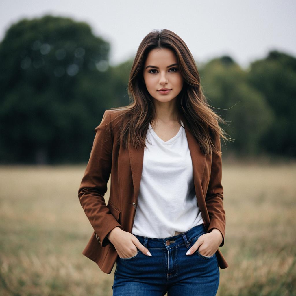 Portrait of a young woman standing outdoors in a natural setting with blurred trees in the background. She has long brown hair, brown eyes, and is wearing a white shirt paired with a brown blazer and blue denim jeans. She stands confidently with her hands in her pockets, looking directly at the camera.