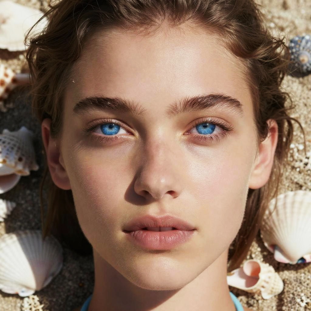 Portrait of a model with ocean blue eyes, natural lighting highlighting the vivid blue hues, surrounded by marine elements like shells and coral, calm and refreshing seaside vibe