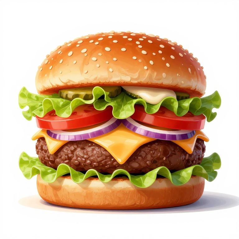"Time-Lapse cheeseburger with hamburger and cheese and lettuce and tomato and onion and pickle, vector, solid white background, photorealistic, hyper realistic, HDR, studio lighting,"