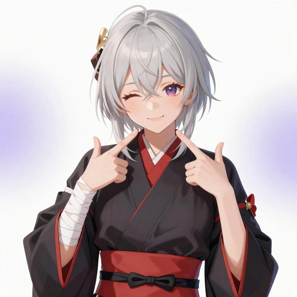 Digital artwork of an anime-style girl with silver hair, winking and pointing with both index fingers. She wears a black and red kimono-like outfit with white bandages on her right arm. Her skin is pale, and her expression is playful. The background is a bright white with subtle purple highlights.