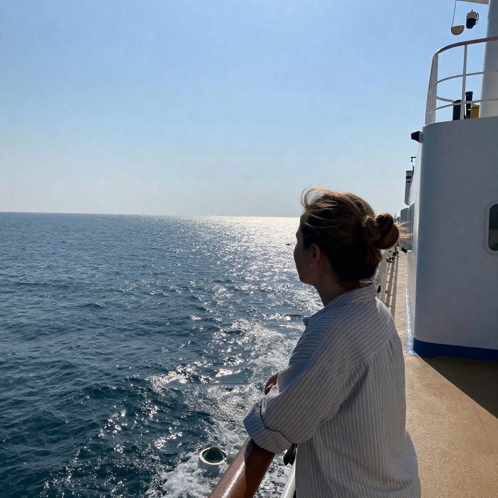 Photograph of a woman with light brown hair in a bun, wearing a striped shirt, standing on a ship's deck. She gazes at a bright, sunlit ocean. The ship's white railing and structure are on the right. The sky is clear with a slight haze.