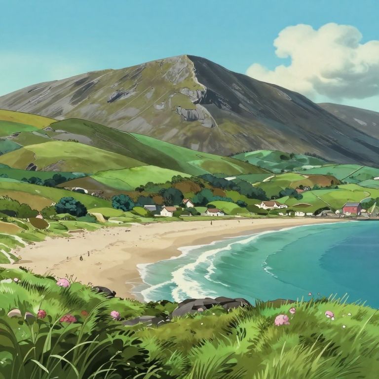 Script beautiful irish landscape with ben bulben in the background, rolling hills and beaches, studio ghibli,