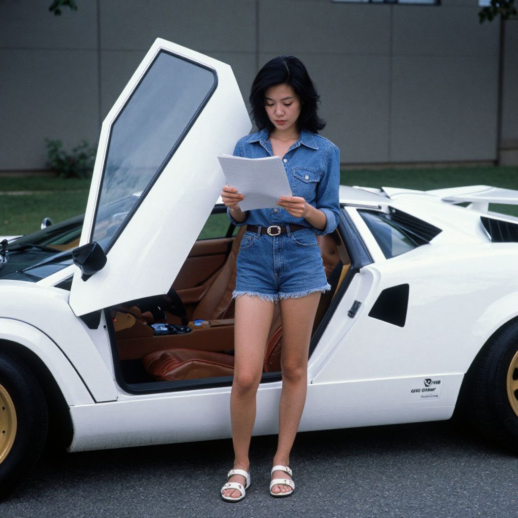Phoenix asian woman standing next to a white Lamboroghini Countach while reading some documents, one car door open, 1980s, ultra realistic,