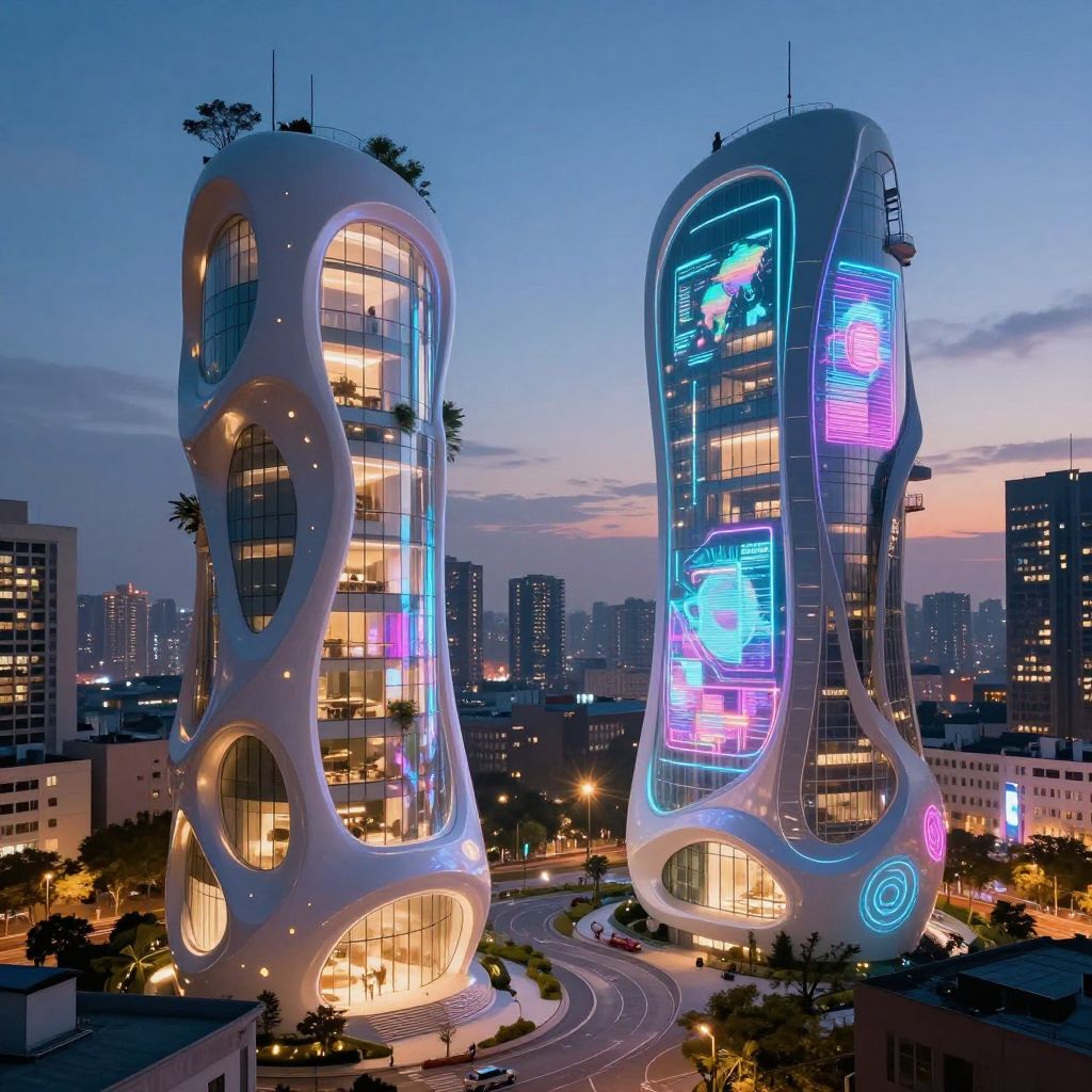 AI generated houses in a surreal urban environment, blending organic shapes with cutting-edge digital designs, featuring transparent walls, floating elements, and vibrant holographic displays, set against a dusk sky with glowing city lights.