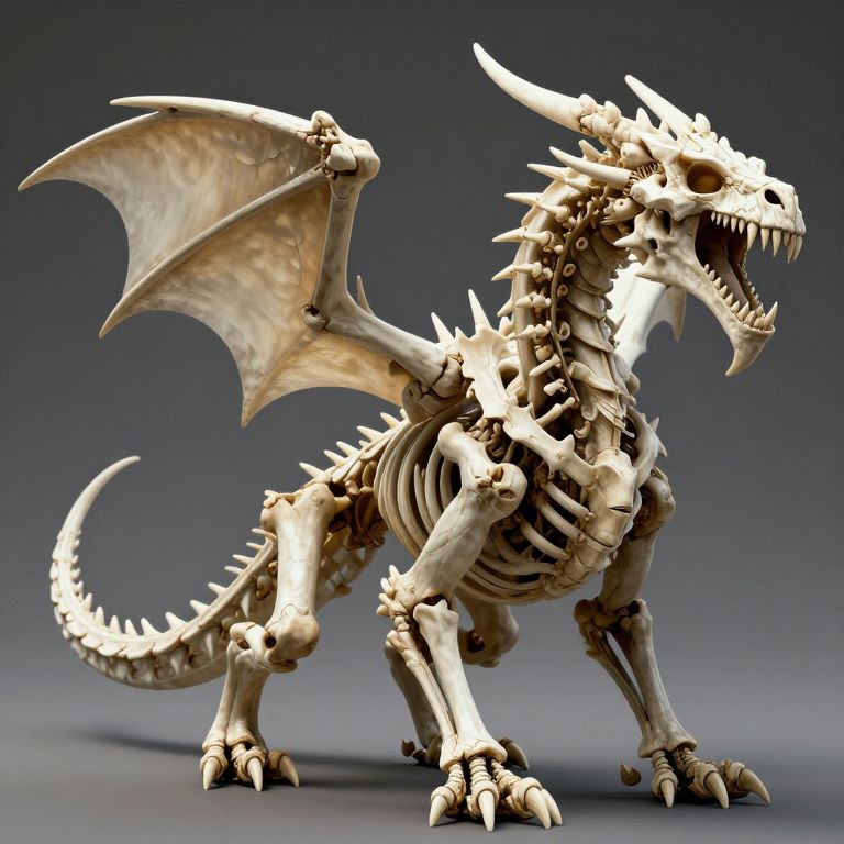 CGI image of a skeletal dragon with large wings, sharp claws, and spikes along its spine and tail, set against a gradient gray background.