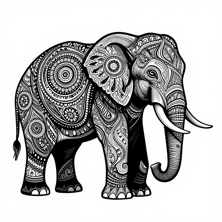 The image is a highly detailed, black-and-white vector illustration of an elephant, rendered in a mandala-like style. The elephant is adorned with intricate patterns and designs, featuring a symmetrical arrangement of circular, floral, and geometric motifs. The trunk, ears, and legs are particularly elaborate, with each element meticulously decorated. The lines are bold and sharp, creating a striking contrast against the white background. The overall composition is balanced and harmonious, with the elephant centrally positioned and the patterns flowing seamlessly across its body. The monochromatic palette enhances the visual impact of the detailed artwork, emphasizing the complexity and artistry of the design.