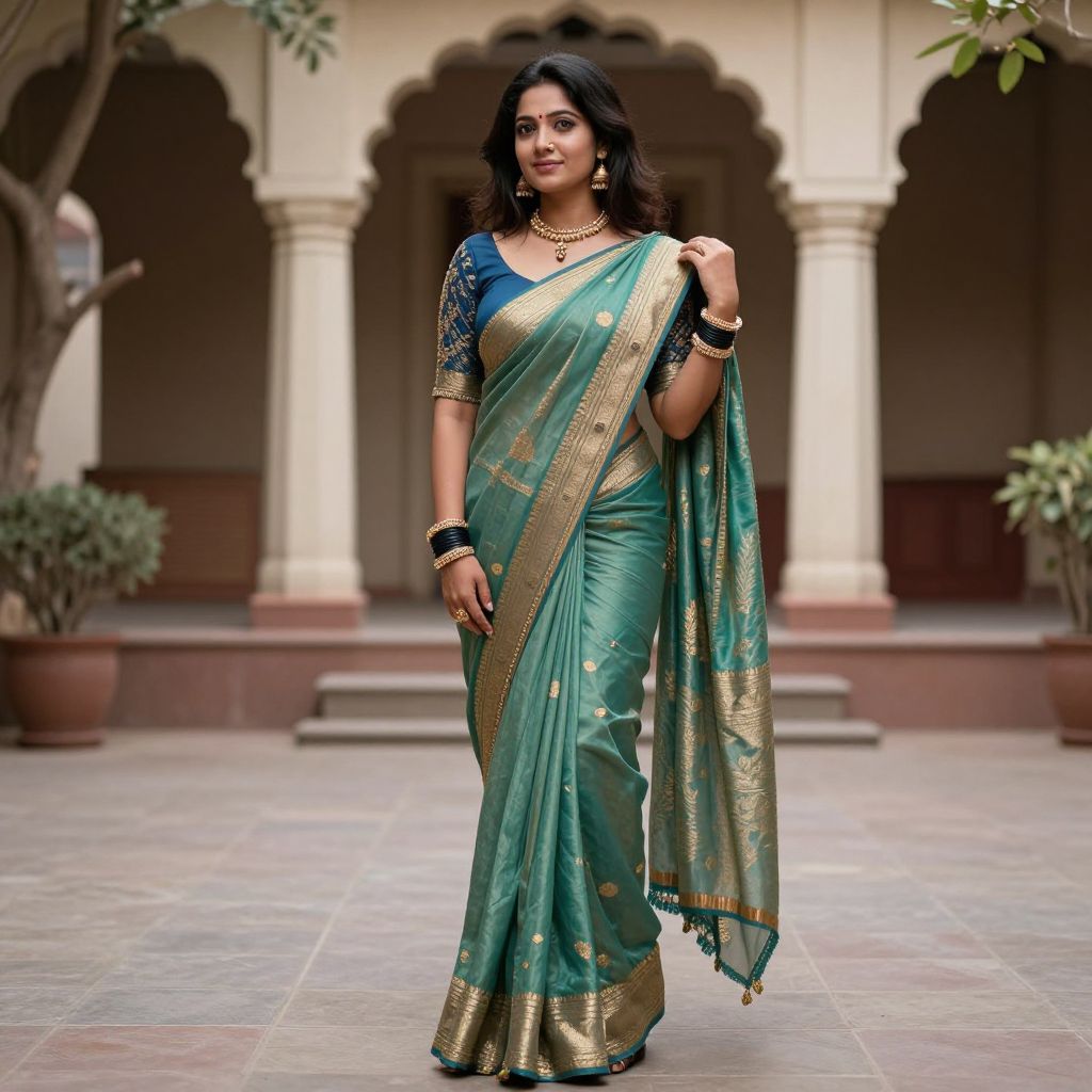 Photograph of a confident Indian woman with medium-dark skin and long, wavy black hair, standing in an outdoor courtyard. She wears a teal green saree with gold borders, paired with a blue blouse adorned with gold embroidery. She accessorizes with black bangles, a gold necklace, and a black bracelet. The background features arched columns and potted plants, with a tiled floor. She holds her saree's pallu in her right hand, standing in a poised, elegant manner. The lighting is natural, highlighting her serene expression and stylish attire.