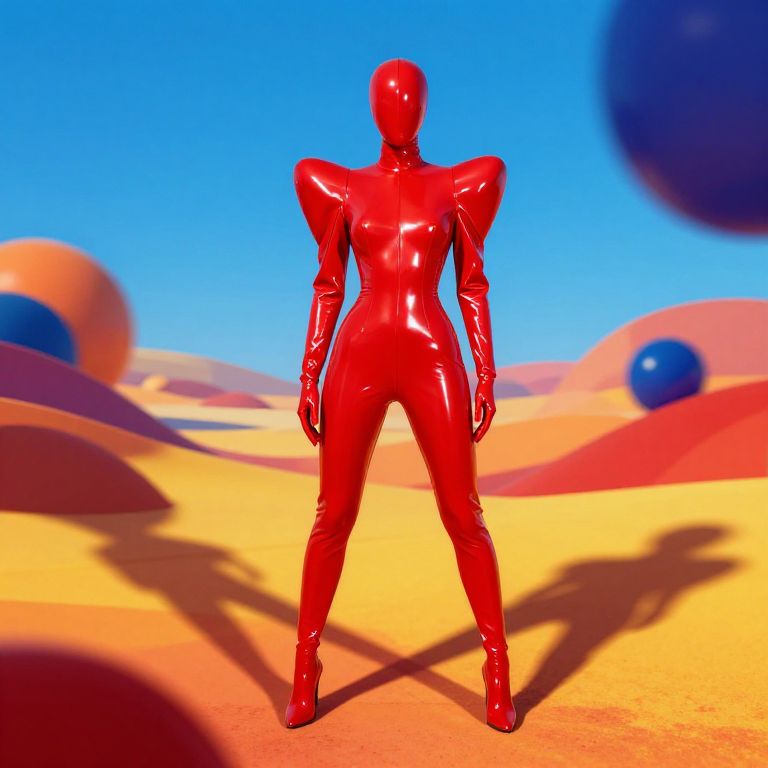 Red latex outfit in a surreal landscape, glossy material reflecting abstract shapes, fantasy environment with bright colors and dynamic shadows, striking and bold composition