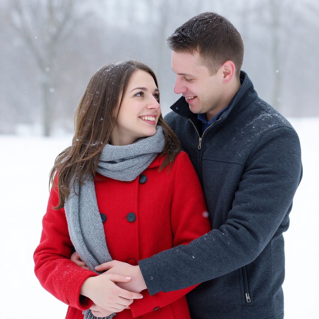 Winter engagement session captures a joyful couple embracing in a snowy landscape, with the woman wearing a vibrant red coat and gray scarf, while the man dons a dark gray zip-up jacket, both smiling warmly as snowflakes gently fall around them.