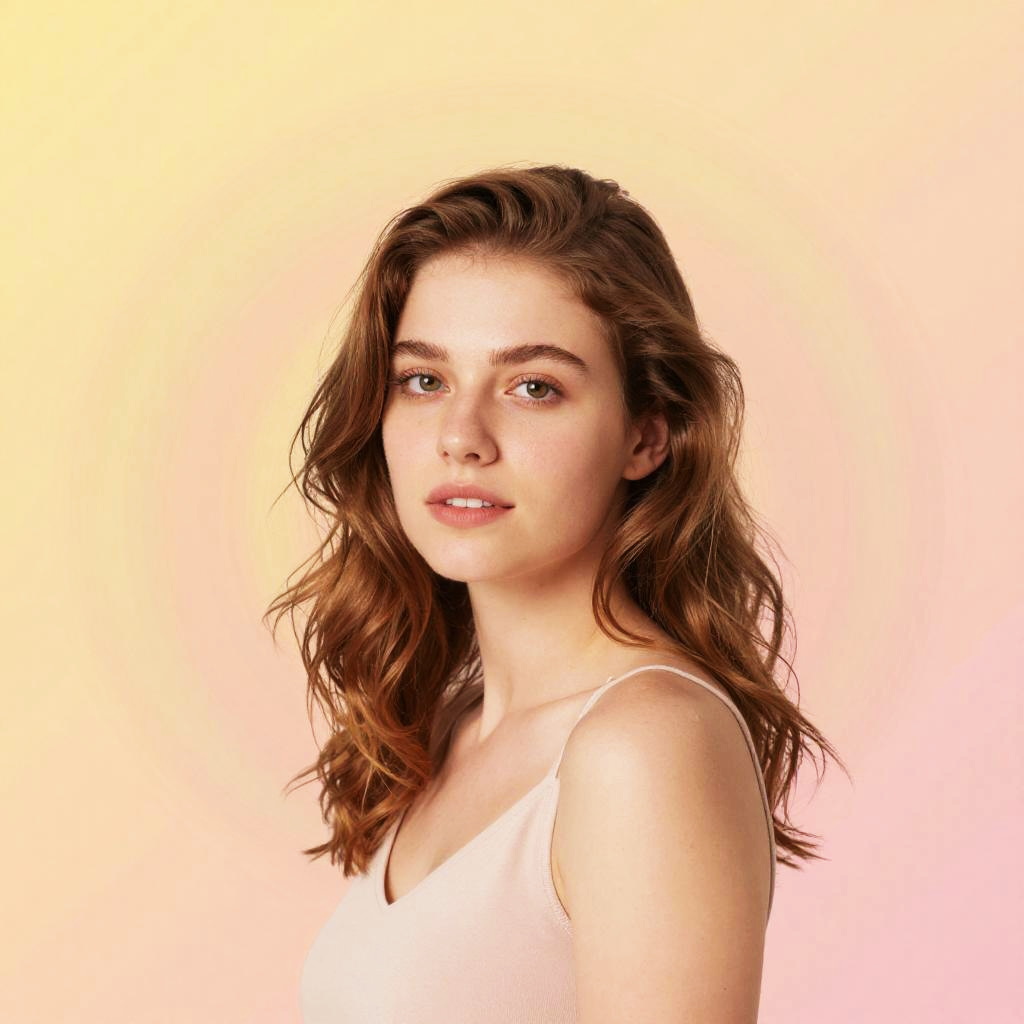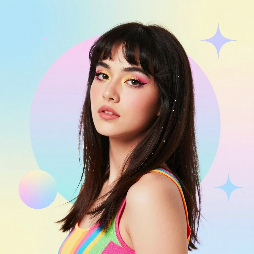 Portrait of a person with 80s style bangs, bright makeup, colorful clothing, dynamic background with geometric shapes and pastel gradients, retro-futuristic vibe