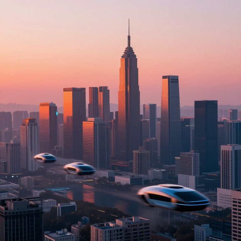 Photorealistic digital illustration of a sleek, silver, futuristic flying car with a streamlined, aerodynamic design, emitting a subtle purple smoke trail. It hovers above a bustling, neon-lit cityscape at dusk. The background features tall skyscrapers with illuminated windows, colorful LED signs, and a pink and orange sky. The flying car has a glossy finish, with reflective surfaces and angular lines, suggesting advanced technology. The urban landscape below is densely packed with buildings, creating a vibrant, cyberpunk atmosphere. The overall image conveys a sense of modernity and advanced transportation technology in a futuristic urban setting.