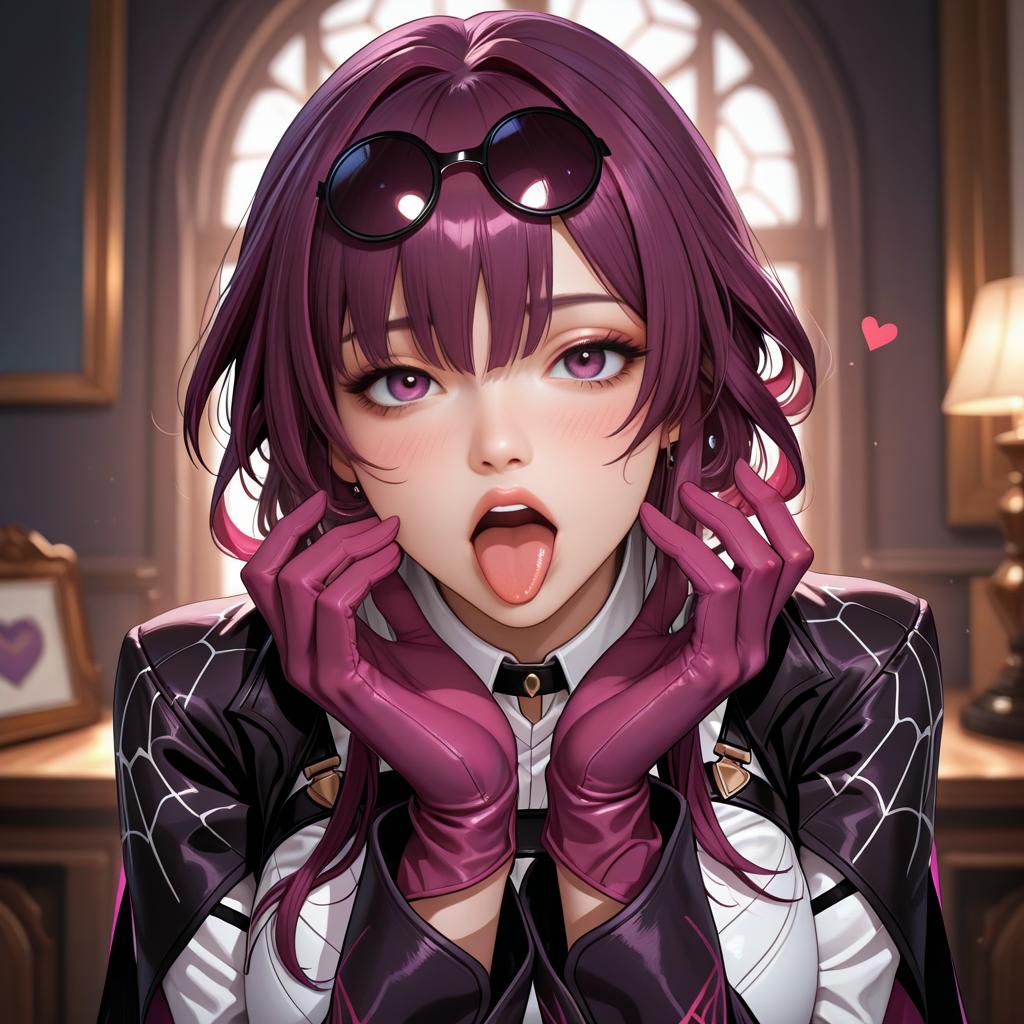Kafka_honkai__star_rail, purple hair, blush, multiple girls, heart, 2girls, open mouth, gloves, purple eyes, tongue out, sweat