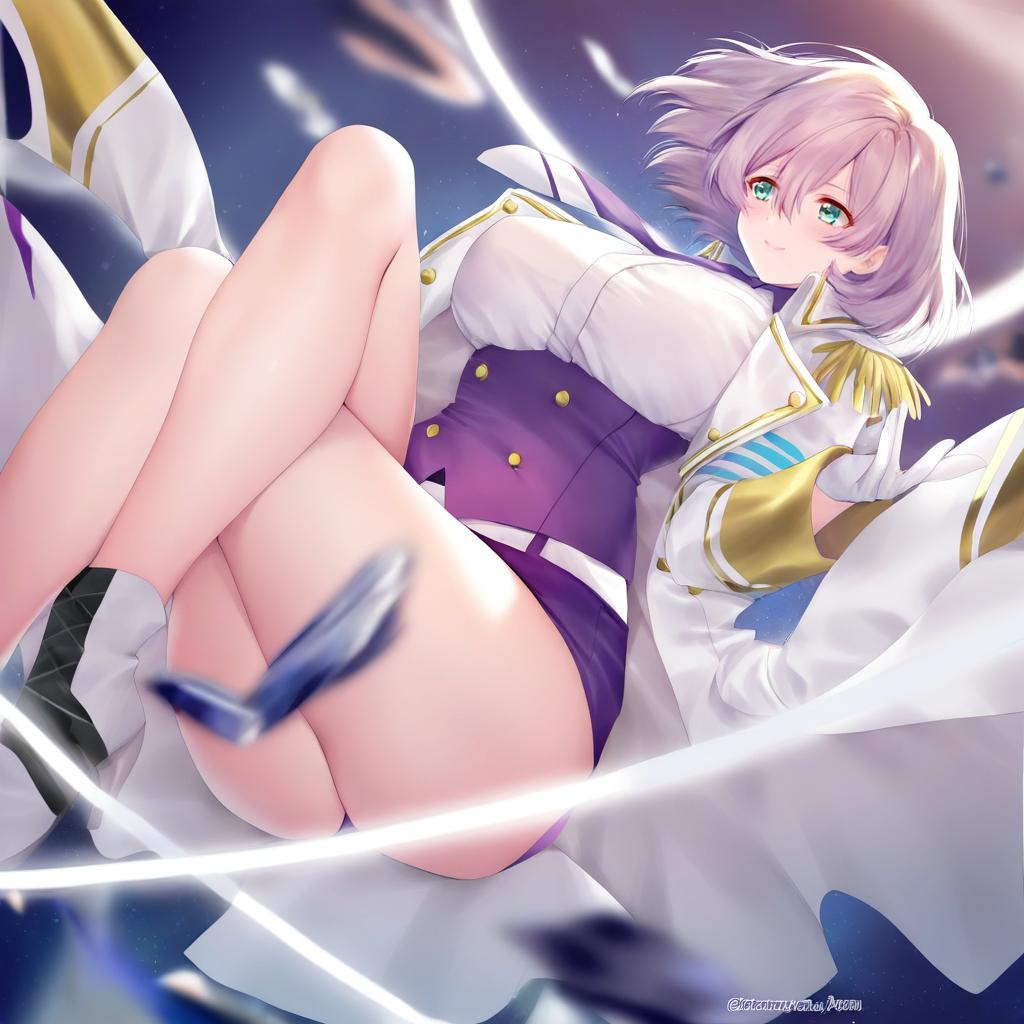 Mujina, gridman universe, 1girl, blue eyes, hair between eyes, short hair, brown hair, grey hair, large breasts, thighs, white gloves, white jacket, military jacket, purple shorts, corset, by artist hazuki natsu, dark_illustrious