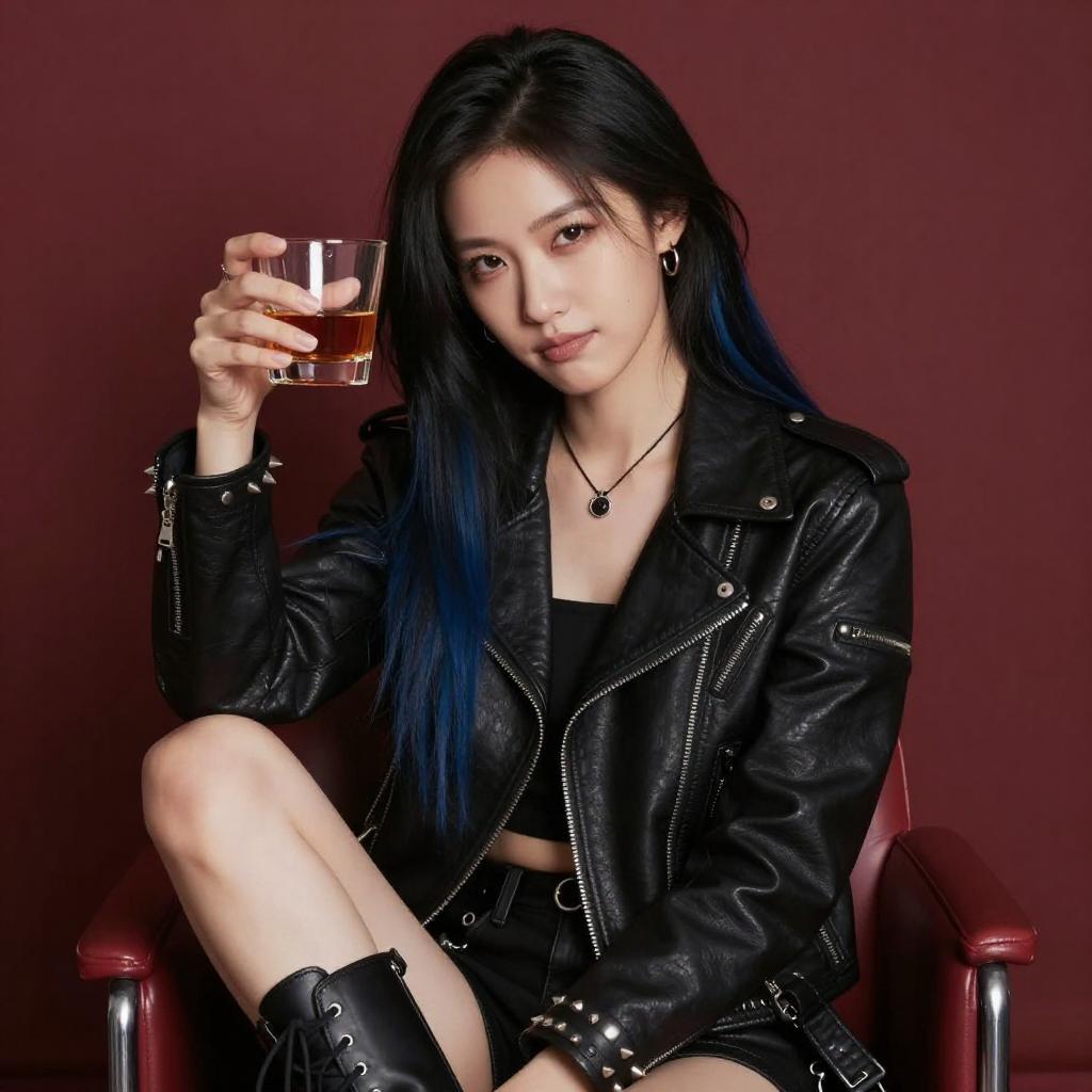 Photograph of a pale-skinned woman with long, black and blue-dyed hair, wearing a black leather jacket, black lace-up boots, and studded wristbands. She sits on a red chair, holding a glass of amber liquid in her right hand, with a confident, slightly smirking expression. The dark, ured background contrasts with her bold, edgy appearance.