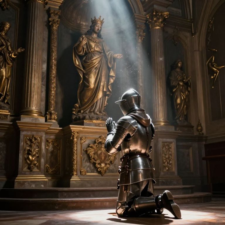 Knight praying art, dramatic scene of a knight kneeling in front of a sacred statue inside a dimly lit chapel, rays of light illuminating dust particles, richly textured environment, emotional depth and reverence, balanced composition, baroque-inspired lighting and color palette