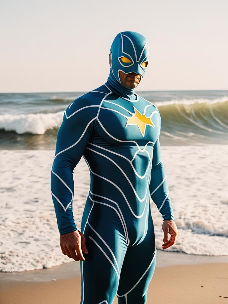 A man wearing a full-body blue superhero costume with white lines and a yellow star emblem on the chest, styled as 'Wave Man,' standing on a sandy beach with ocean waves in the background. The costume includes a matching mask with yellow eye coverings.