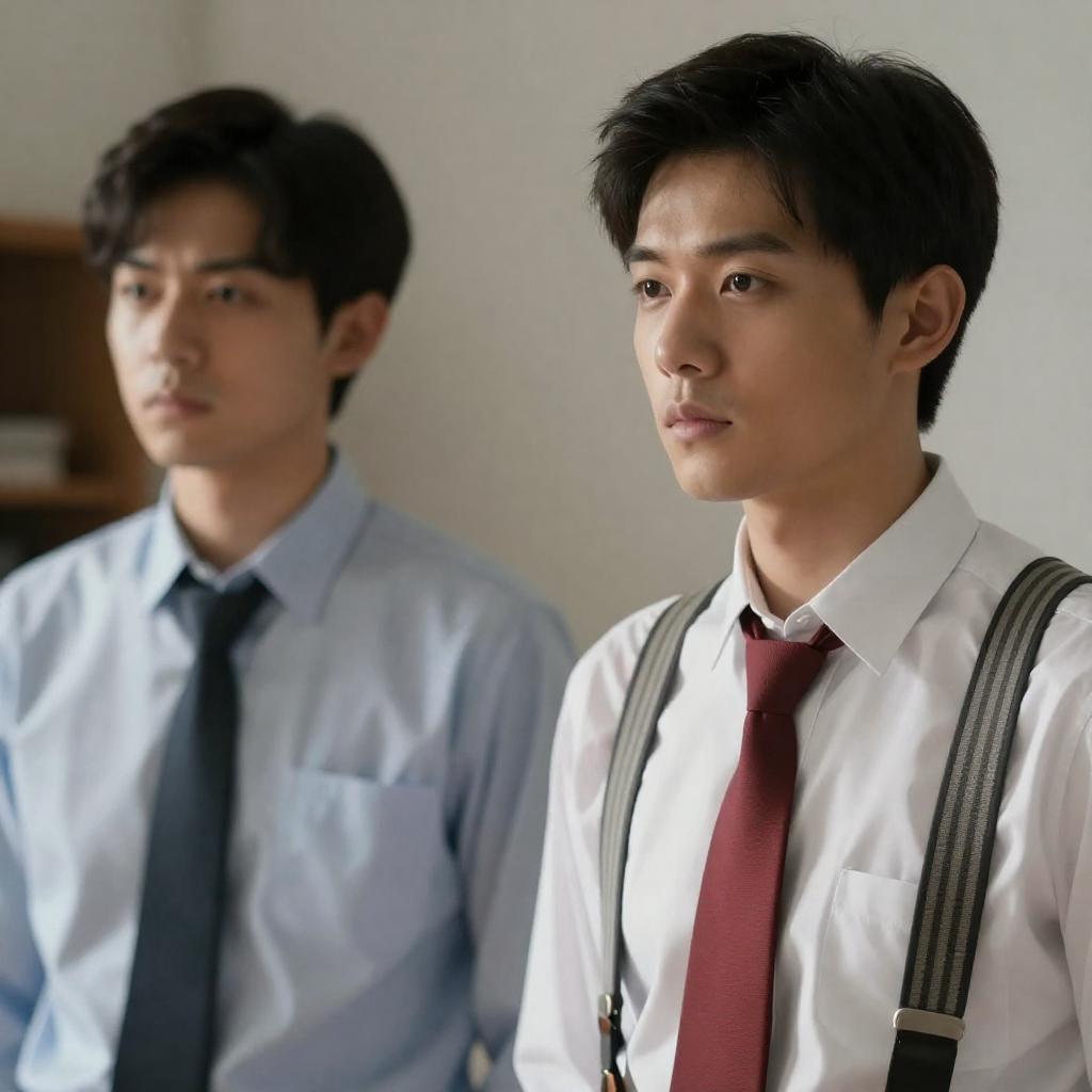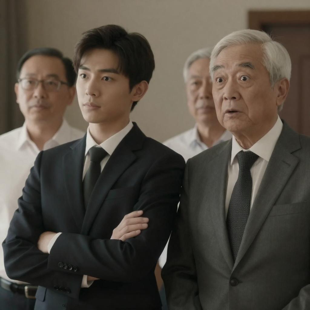 Photograph of three East Asian men. One man with dark hair and black suit holds a card with a woman's face, looking intently. Second man, mustached, in gray suit and white shirt, leans forward. Third man, in brown sweater, looks to the right. Table with scattered objects in background. Intense expressions.