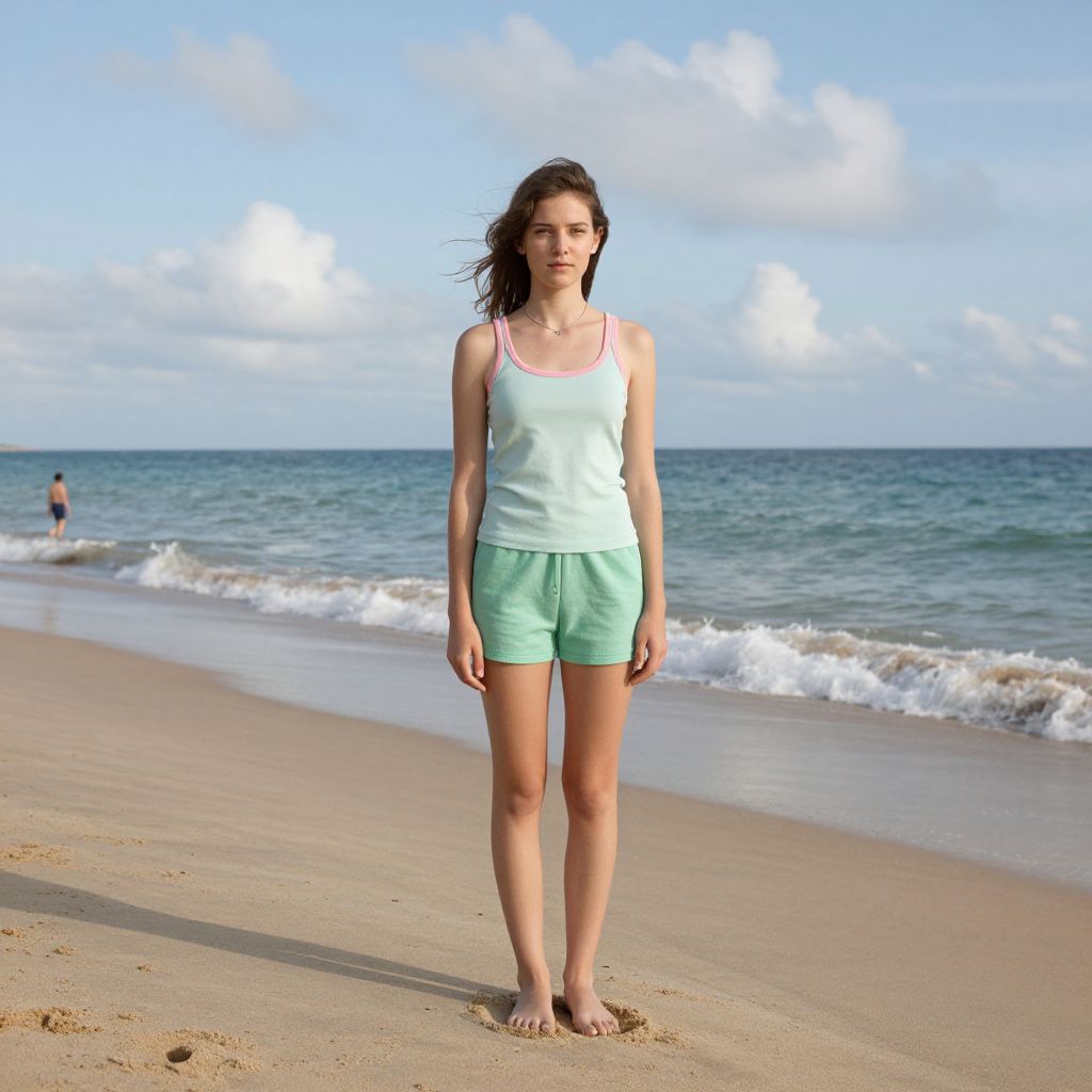 In this Rineke Dijkstra style beach photograph, a young woman stands confidently on the sandy shore, her hair tousled by the gentle breeze. She is dressed in a light green tank top with a pink trim and matching green shorts, her outfit complementing the serene beach setting. The ocean, a vast expanse of blue-green, stretches out behind her, its waves lapping at the shore. In the distance, another figure can be seen walking along the water's edge, adding depth to the scene. The sky above is a soft, cloudy blue, with fluffy white clouds scattered across it, creating a tranquil and picturesque atmosphere. The composition is balanced, with the woman positioned centrally, drawing the viewer's eye to her as she stands in the foreground, while the ocean and sky frame the scene, creating a harmonious and visually appealing image.