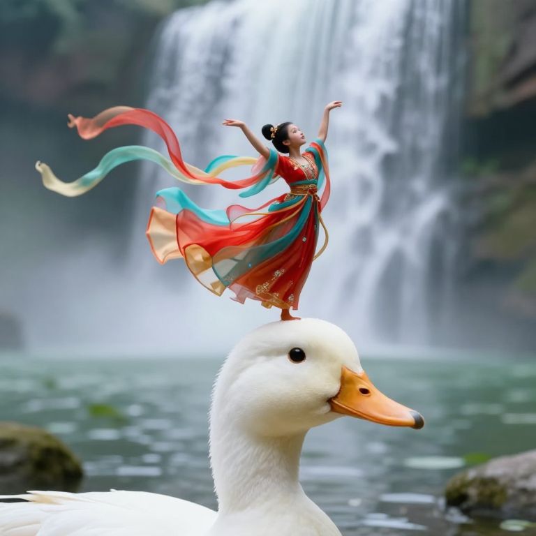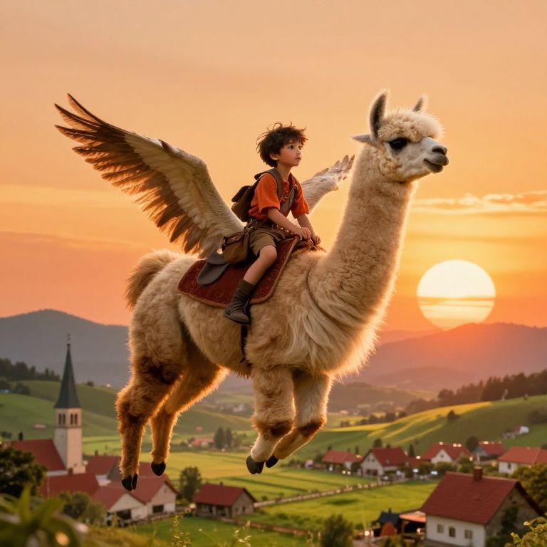A whimsical and fantastical scene featuring a young boy riding on the back of a majestic giant white goose soaring through a vibrant, sunlit sky, The boy is dressed in an adventurer's outfit, with a rugged orange shirt, brown shorts, and a satchel slung over his shoulder, evoking a sense of youthful curiosity and exploration, His expression is one of calm determination as he holds onto the goose's feathers, The goose is depicted with expansive wings spread wide, capturing the motion of flight as it glides gracefully above a picturesque countryside, Below, a quaint village with red-roofed houses, a towering church spire, and lush green fields is nestled among rolling hills and distant mountains, creating a serene and idyllic backdrop, Birds flutter in the sky around them, adding a sense of liveliness and wonder to the scene, The warm orange glow of a massive setting sun dominates the horizon, bathing the entire composition in golden light and enhancing the magical atmosphere, The art style is richly detailed, with vibrant colors and intricate textures that bring the fantastical world to life, evoking themes of adventure, freedom, and a connection to nature
