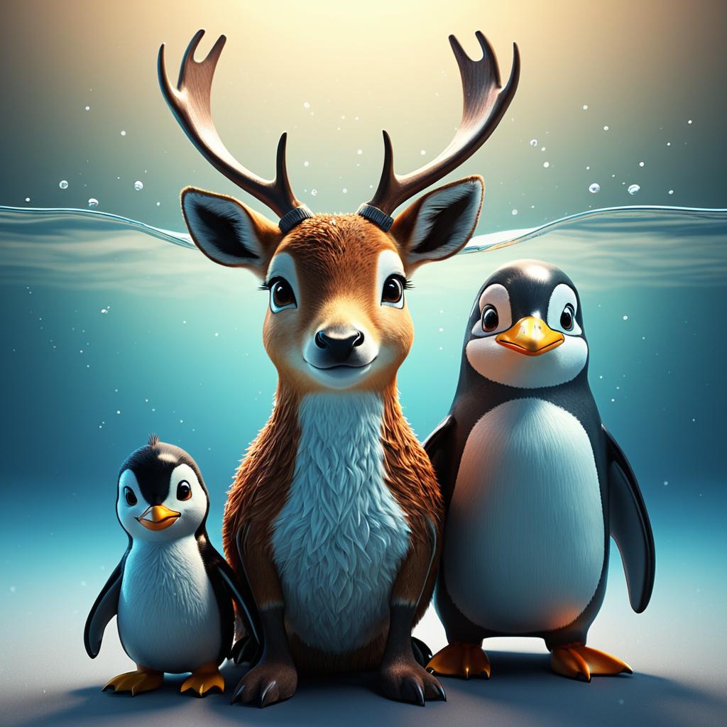 Translucent a cartoon portrait with three characters: a sneaky male raccoon, a proud mum moose, and a little boy turtle. Portrait, chiaroscuro, holy cinematic lighting, 3D, C4D, blender, gradient background, octane rendering.