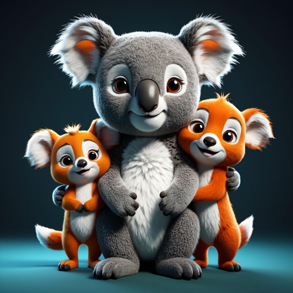 A 3D rendered cartoon portrait featuring three anthropomorphic animal characters: a sneaky male raccoon with detailed fur, a proud mother moose standing confidently, and a little boy turtle wearing a green backpack and scarf. The image showcases chiaroscuro and cinematic lighting with a smooth gradient background, created with advanced 3D software like Cinema 4D and Blender using octane rendering.
