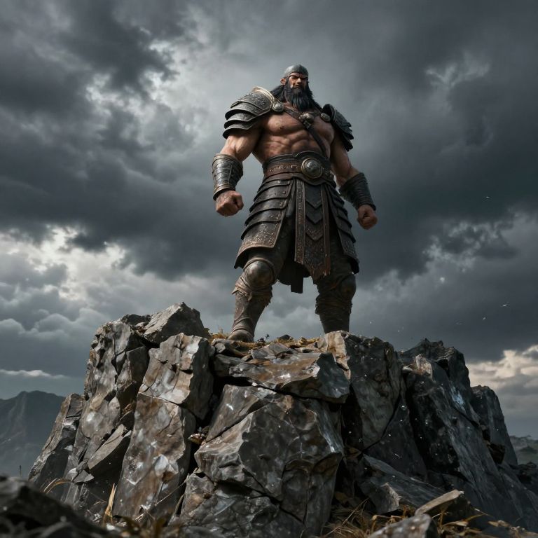 Tгјllrock, an ancient mythical warrior standing atop a rugged cliff composed of tгјllrock stones, stormy skies in the background, dynamic lighting highlighting powerful muscles and worn armor, dramatic, highly detailed, cinematic composition
