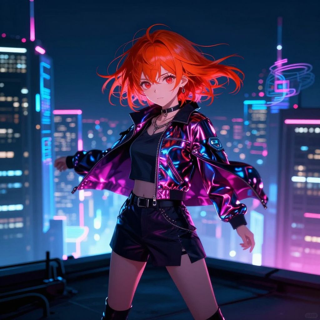 Digital anime-style artwork of a red-haired girl with glowing eyes, wearing a black jacket and shorts, standing in a neon-lit cityscape at night