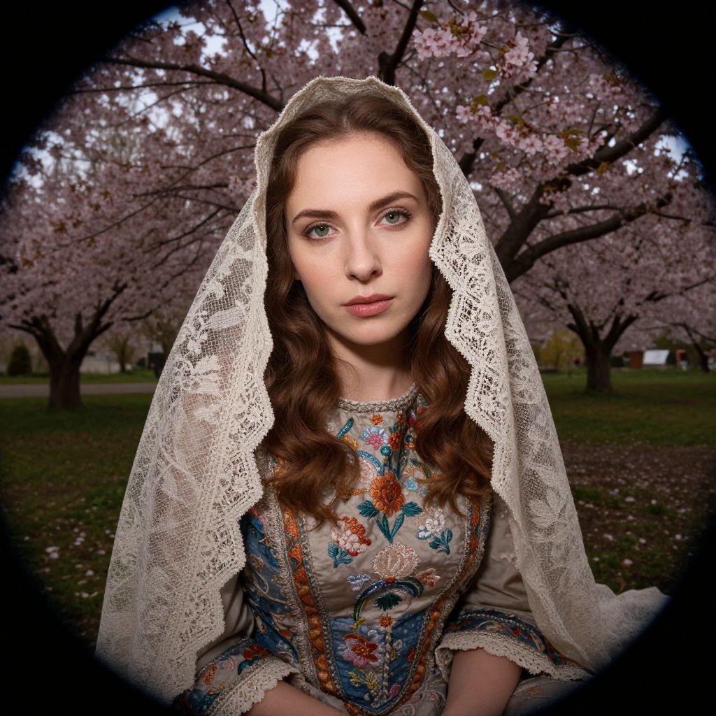 A photorealistic portrait captures the enigmatic charm of a European woman with striking green eyes and porcelain skin. She is bathed in a soft, diffused light that filters through a lace veil draped over her hair, creating delicate shadows that contrast with the rich textures of her intricate embroidery dress. The woman sits amidst a serene garden vibrant with cherry blossoms, evoking an emotional gradient that transitions from the tranquility of nature to her captivating presence. Framed within an unconventional fisheye lens perspective, this image highlights the interplay of light and texture, casting a mesmerizing sense of warmth and mystery that draws viewers into the beautiful, enchanting world she inhabits.