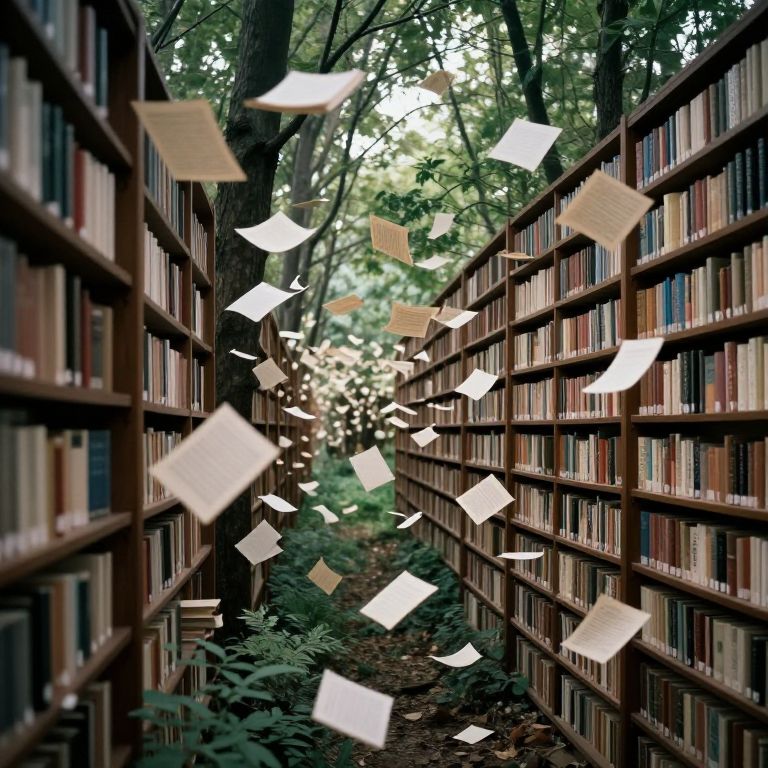 Photograph of a narrow, tree-surrounded library aisle with tall, wooden bookshelves on both sides, filled with books. White, glowing papers float in mid-air, creating a magical, ethereal effect. The background shows green leaves and tree trunks, with dappled sunlight filtering through. The books are uniformly arranged, and the floating papers are scattered randomly. The overall scene combines natural and mystical elements, with a focus on the contrast between the dark wood and bright, glowing papers. The image has a whimsical, almost dreamlike quality.