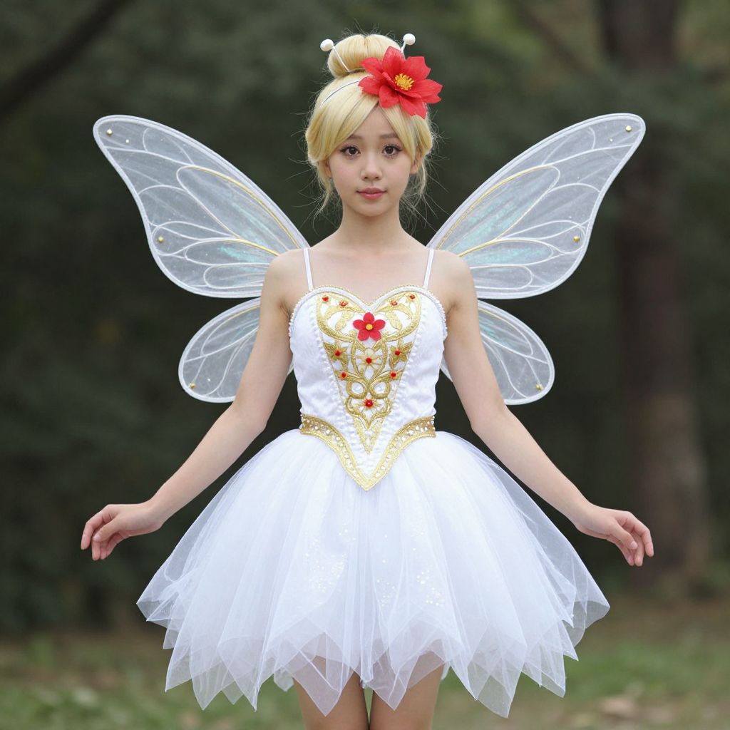 Sprite Fairy Costume, fairy in a white dress with a gold and red flower