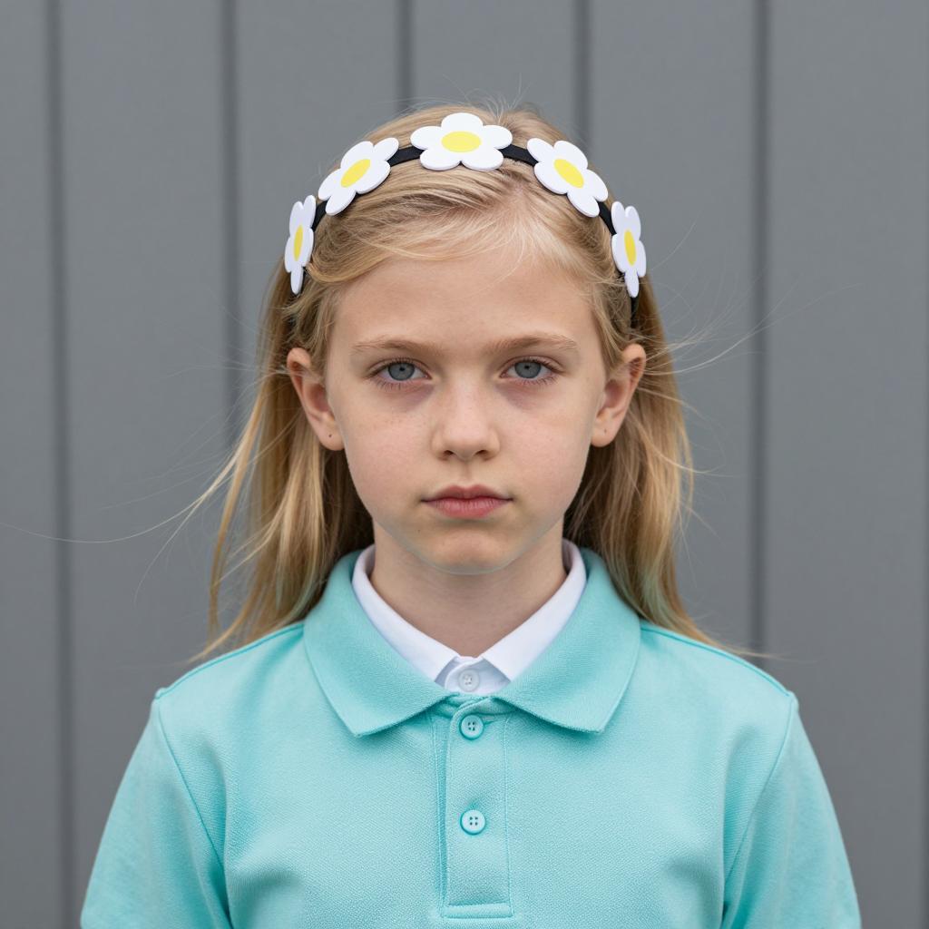 Young girl with light blonde hair, wearing a turquoise polo shirt, white collared shirt underneath, and a headband with six white flower-shaped adhesive bandages. Her hair is flung out to the sides, and she has a neutral expression. Background consists of vertical, blurred, greyish wooden panels.