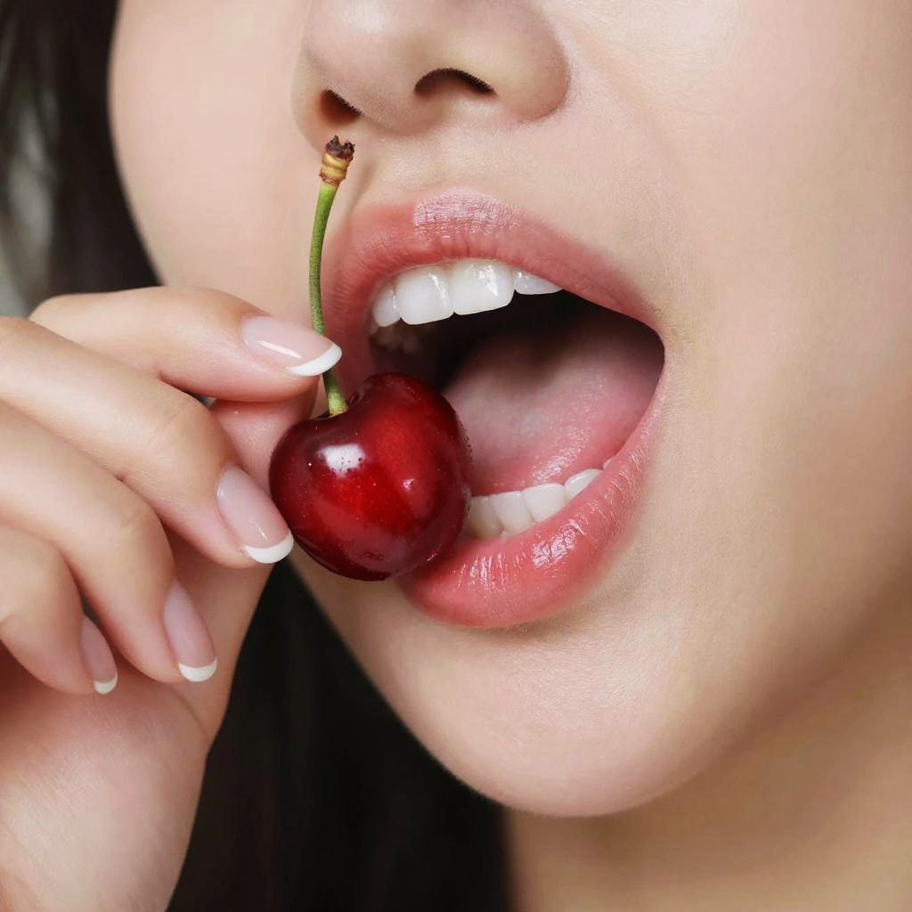 Close-up photo of a woman with light skin and glossy pink lips, slightly open to reveal white teeth. She's holding a shiny red cherry near her mouth with her manicured fingers, which have white nail polish. The background is blurred, focusing attention on her face and the cherry. The image has a sensual, playful vibe.
