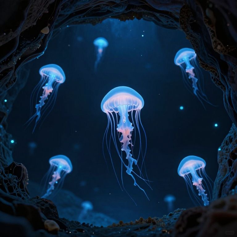 Swarm-intelligent jellyfish colonize the subterranean voids beneath floating mountains, communicating through pulses of bioluminescent poetry.