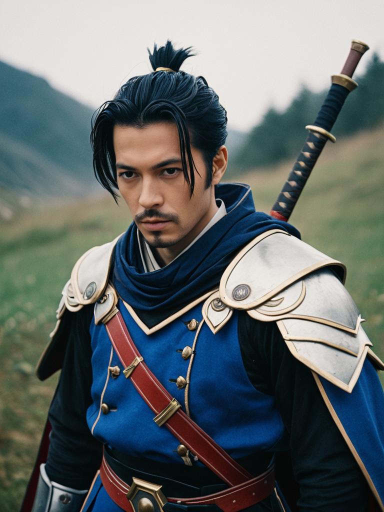 Man in Childe Genshin Outfit, photorealistic outdoor portrait in fantasy landscape