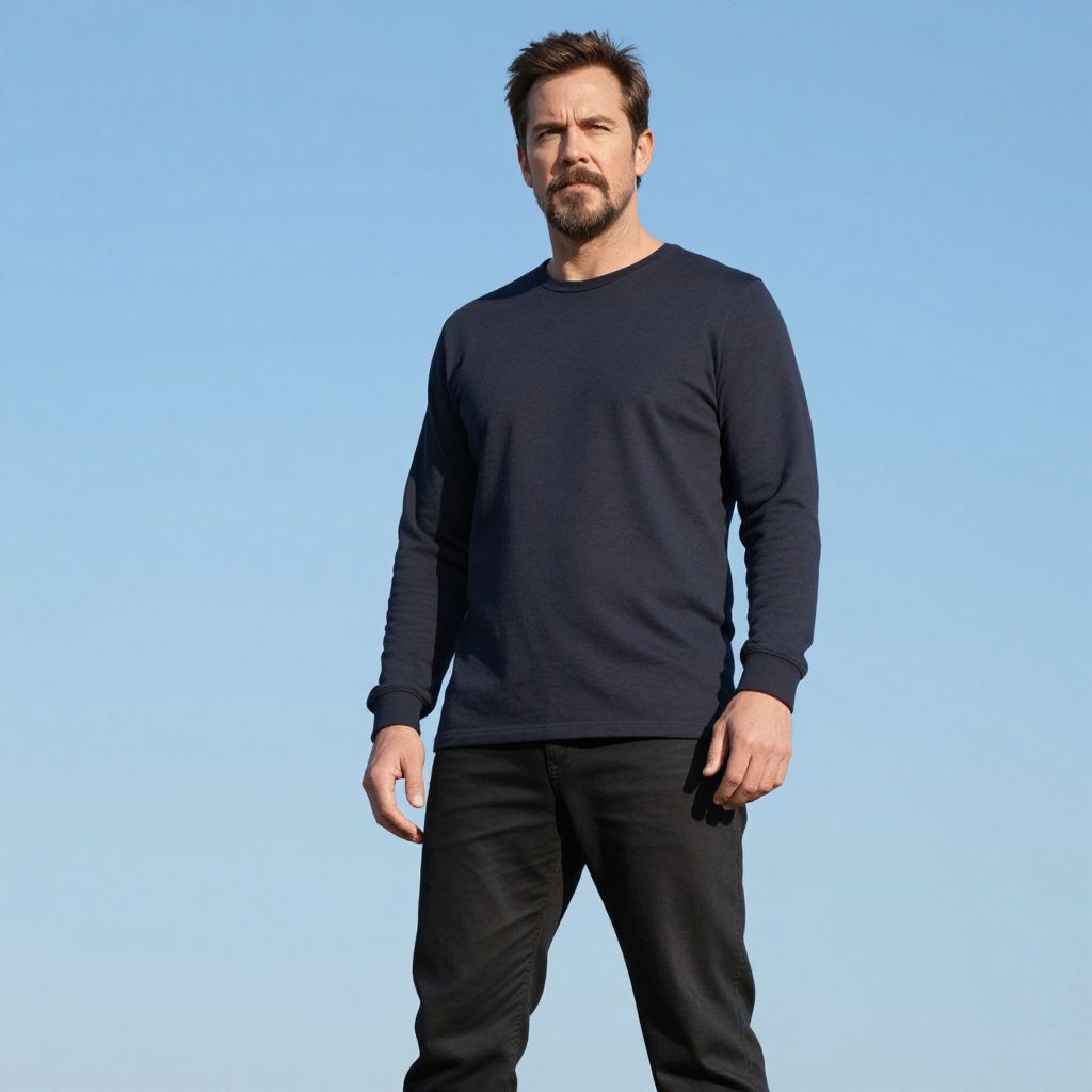 Photograph of a rugged man with short brown hair, wearing a blue denim jacket, plaid shirt, olive pants, and tan boots, standing on